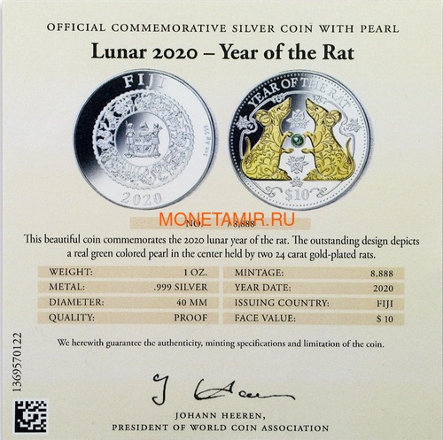 Фиджи 10 долларов 2020 Год Крысы Лунный Календарь Жемчужина (Fiji 10$ 2020 Lunar Rat Pearl 1 Oz Silver Coin).Арт.67